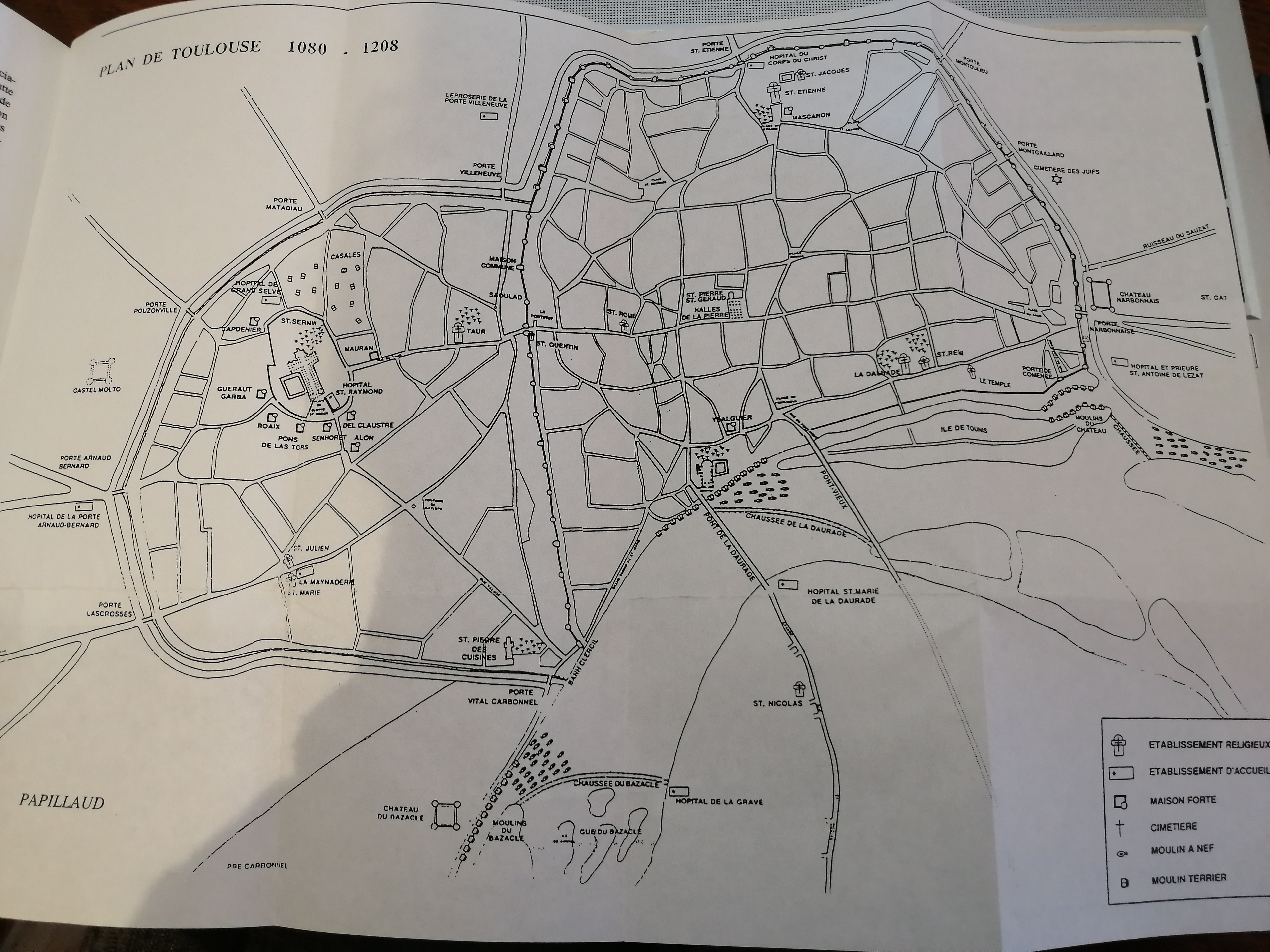 Plan de Toulouse 1080-1208 soit avant la construction du pont du Bazacle qui a eu lieu quelques années après mais on peut voir en bas de la carte la chaussée et le gué du Bazacle, l'emplacement du chateau et des moulins et la porte Vital Carbonnel